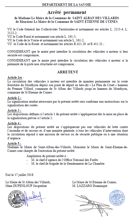 Rappel : la piste du Monthyon est fermée à la circulation des véhicules à moteur, de façon permanente, entre son départ (du lieu-dit Le Villaret) jusqu'à son arrivée au hameau du Monthyon. Elle est empruntée aux risques et périls des usagers.