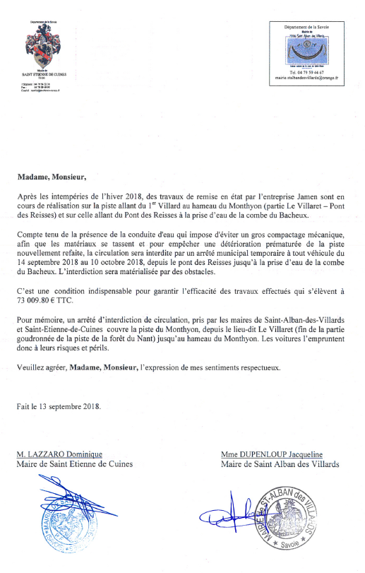 Madame le Maire – Mairie de St Alban des Villards – Chef-lieu – 73130 St Alban des Villards