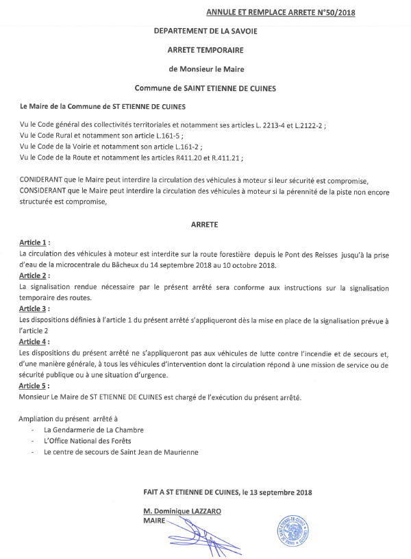 L'accès à la combe du Bacheux est fermé à la circulation des véhicules à moteur du 14 septembre 2018 au 10 octobre 2018, afin d'empêcher une détérioration prématurée de la piste, nouvellement refaite. (arrêtés ci-contre et ci-dessous)