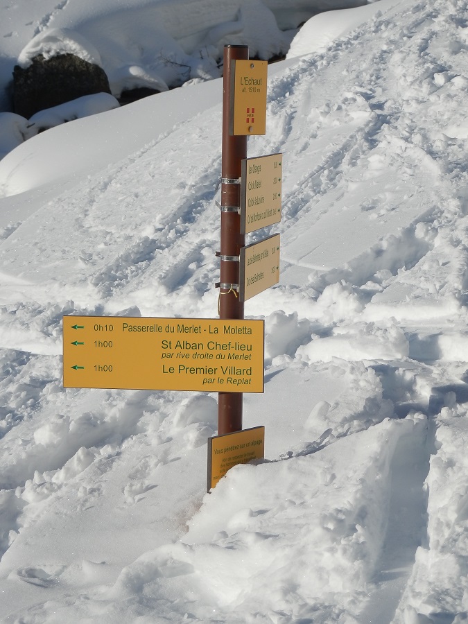 C'est près du monument aux morts situé au chef-lieu de St Alban, que débute cette balade qui mène au col du Merlet. Parvenu à la Croix des Charrières, il faut continuer pour aller traverser le Pont des Perrières et se retrouver sur la rive droite du torrent. Les premiers chalets de l'Echaut, plus haut ceux des Granges, puis ceux de la Lauze... Des chalets de la Lauze, pour observer la pierre à cupules (environ 2 000 ans avant J.C., néolithique, trace des premiers bergers) descendre de 50 m environ sur la rive droite, entre le chemin et le torrent. Après cette projection dans le passé, l’itinéraire mène vers les chalets en ruine de la Veille Route, puis au col, situé entre le Pic Sud du Merlet (à gauche) et 1er Pic Nord du Merlet. Le retour s'effectue par le même itinéraire.