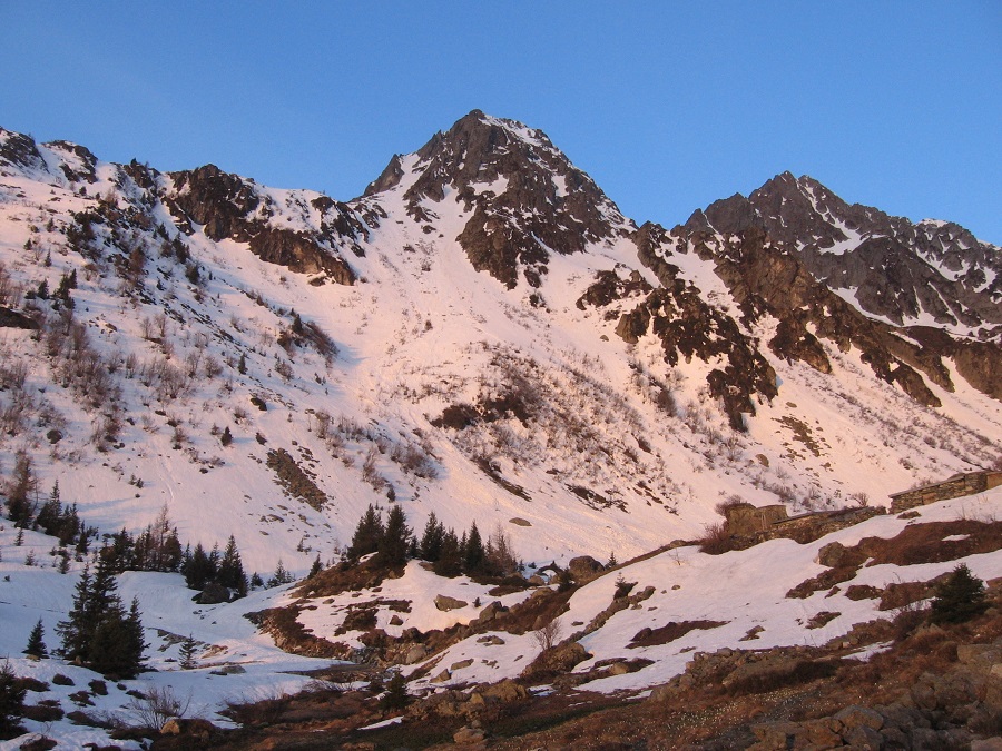 < Accès depuis St Alban des Villards : Combe du Merlet, une des plus empruntées car la plus sûre du secteur, Col du Merlet (2 286 m), course très fréquentée, Col de Lavoire (2 382 m) et Col du Villonnet (2 457 m).